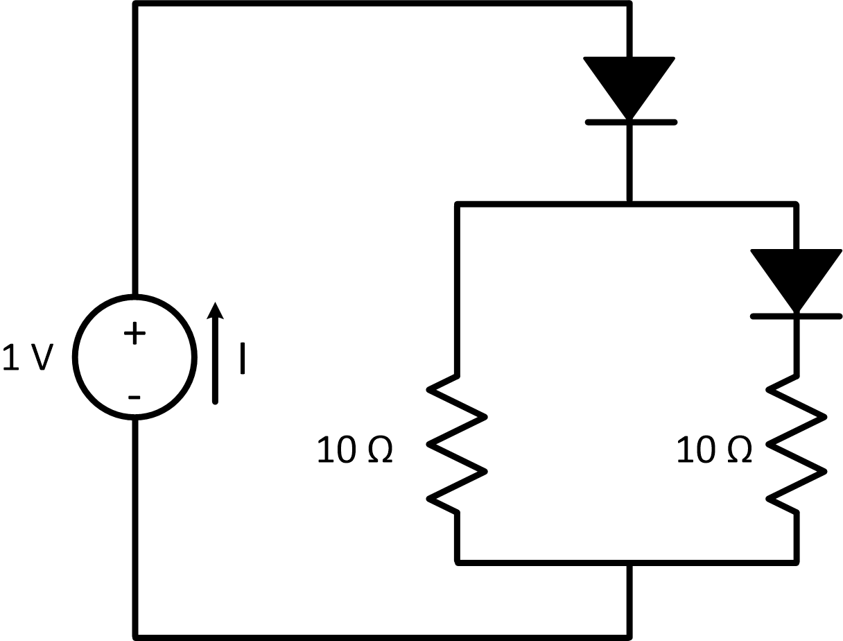 What is the current, \(I\) supplied by the voltage source if \(V_{on} = 0.7V\)