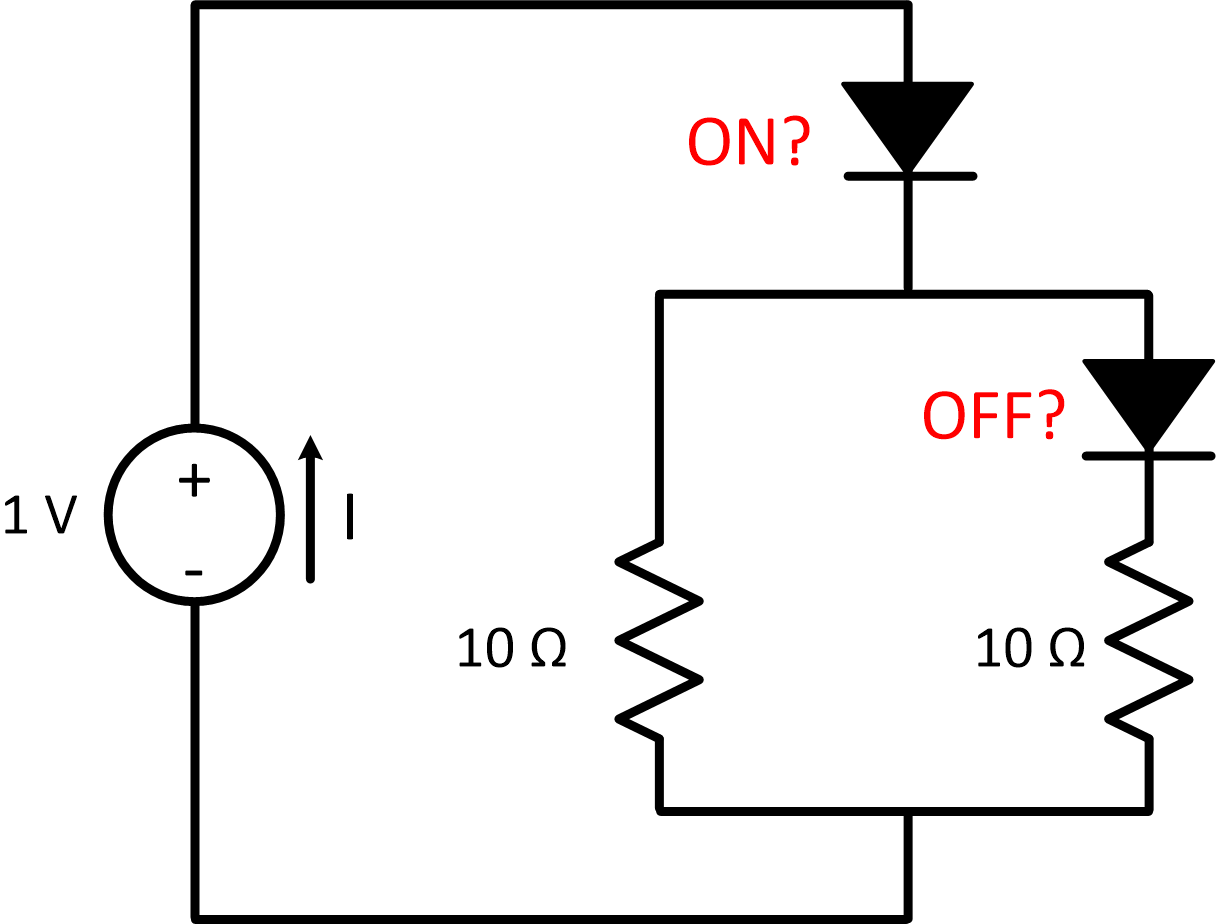 The second diode is a tougher choice. I start off with \(1.0V\), and I guessed that the first diode was ON, so that uses up \(0.7\) of my \(1.0 V\). With only \(0.3\) left over, I'm going to guess that the second diode is OFF.