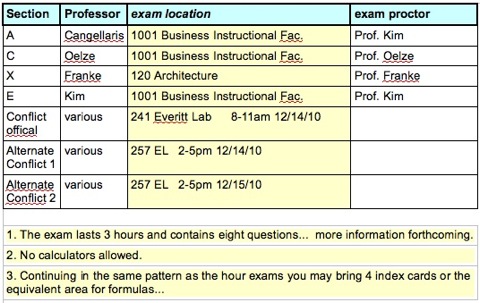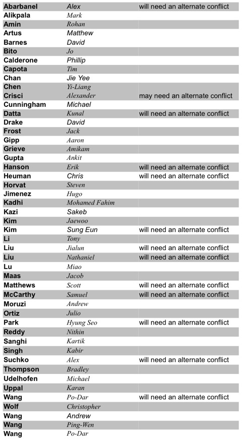 Here is a list of the students who are signed up for the conflict so far - if your name is not on the list please email me - pfranke@illinois.edu - and I will add your name. I apologize if you have already sent me an email and I have missed adding you, there were quite a few emails to wade through.