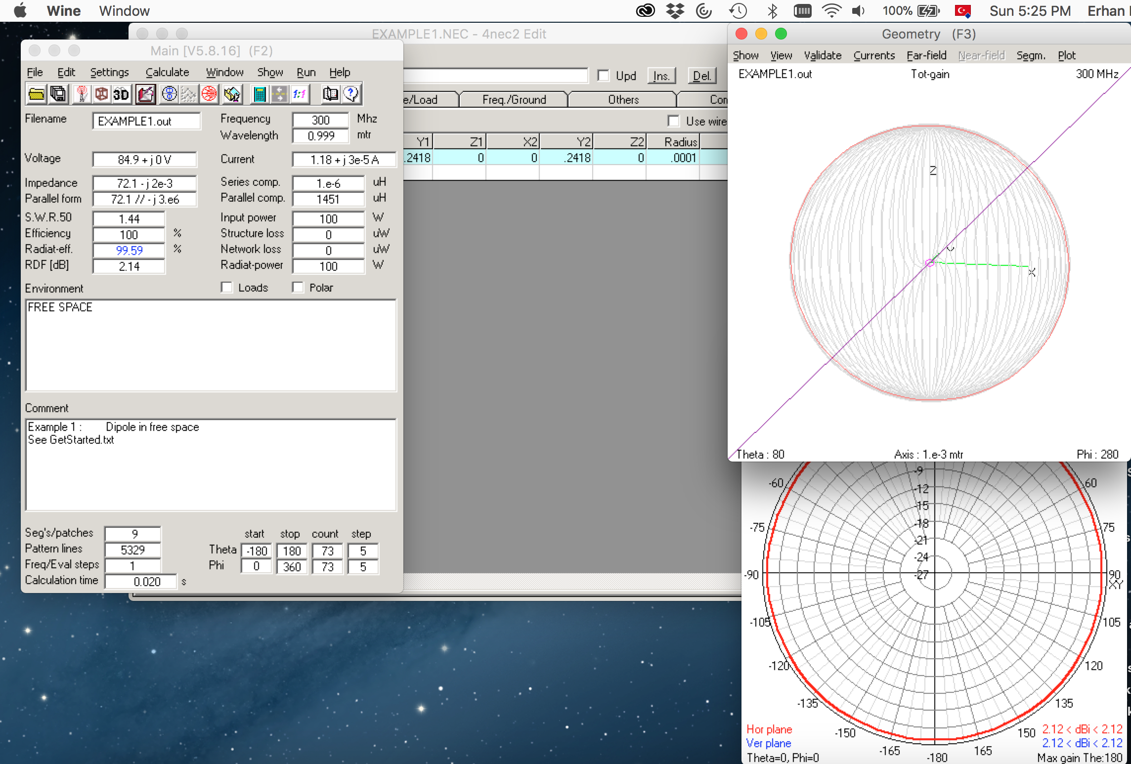properly (with defaults picked at all steps) and starts with default EXAMPLE1.NEC