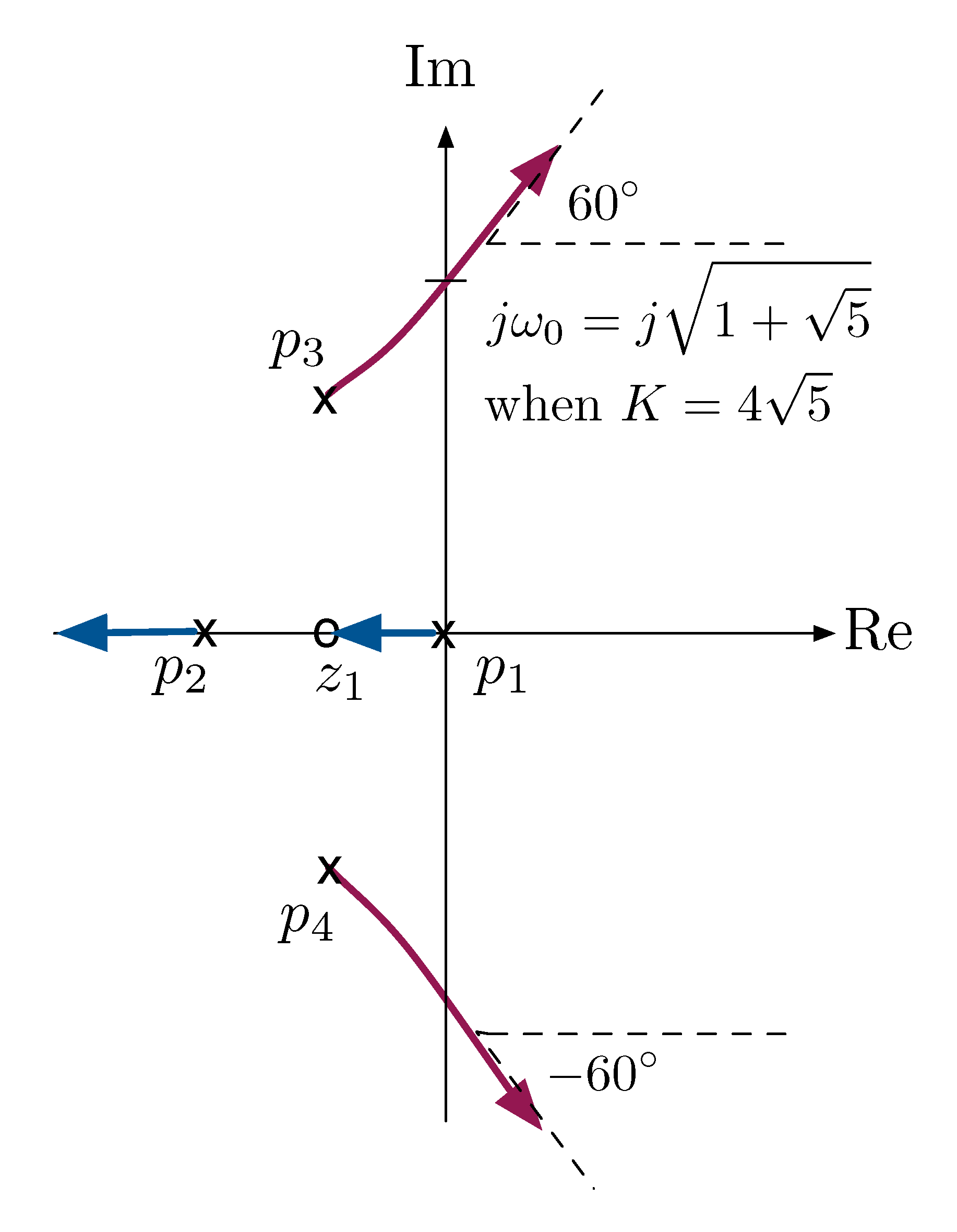 \begin{align*} (j\omega)^4 + 4(j\omega)^3 + 6(j\omega)^2 + (4 + 4\sqrt{5})j\omega + 4\sqrt{5} &= 0 \\ \implies \hspace{2cm} \omega^4 - 4j\omega^3 - 6\omega^2 + (4+4\sqrt{5})j\omega + 4\sqrt{5} &= 0. \\ \implies \hspace{2.17cm} \text{real part is $0$:} \hspace{2.2cm} \omega^4 - 6\omega^2 + 4\sqrt{5} &= 0, \\ \text{imaginary part is $0$:} \hspace{1cm} -4\omega^3 + 4(1+\sqrt{5})\omega &= 0. \\ \end{align*}So \(\omega^2 = 1+\sqrt{5}\), i.e., $jω$-crossing at \(j\omega_0 = \sqrt{1+\sqrt{5}} \approx 1.8\), when \(K = 4\sqrt{5} \approx 8\).