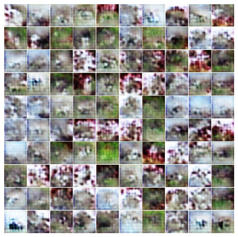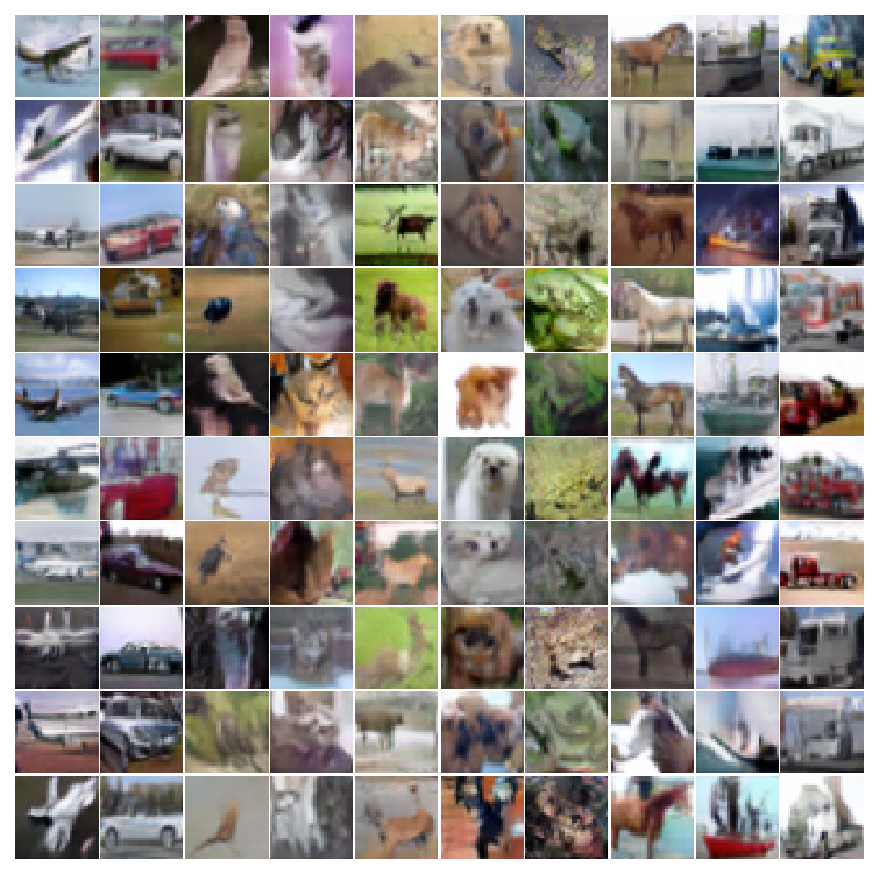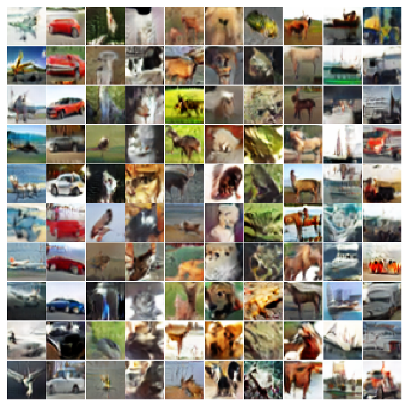 Fake images generated from random noise to look like the CIFAR10 dataset. Each column is a class specific generation. Airplane, Car, Bird, Cat, Deer, Dog, Frog, Horse, Ship, Truck