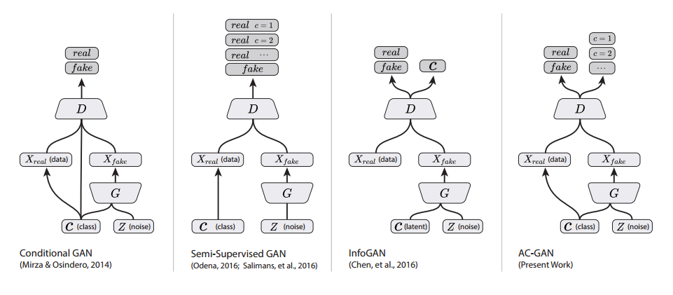 The original GAN formulation was used for unsupervised learning and did not take into account any labels for the data. The final output from the discriminator was of dimension 1 representing the probability of the input being real. Conditional Image Synthesis with Auxiliary Classifier GANs introduced a technique for generating class specific examples by including an auxiliary classifier in the discriminator.