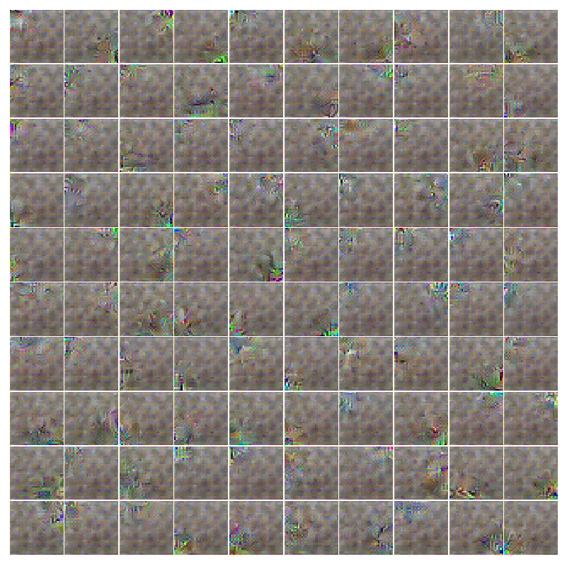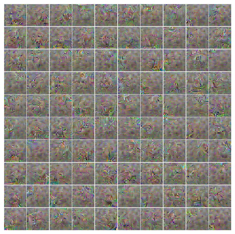 The model evaluates the images and extracts the output from the fc10 layer for each particular class. The gradient is calculated and the original image X is modified by this gradient in order to maximize the output. The learning rate, weight decay, and number of iterations can all be changed to produce different images. Perform this step with both models trained in part 1.