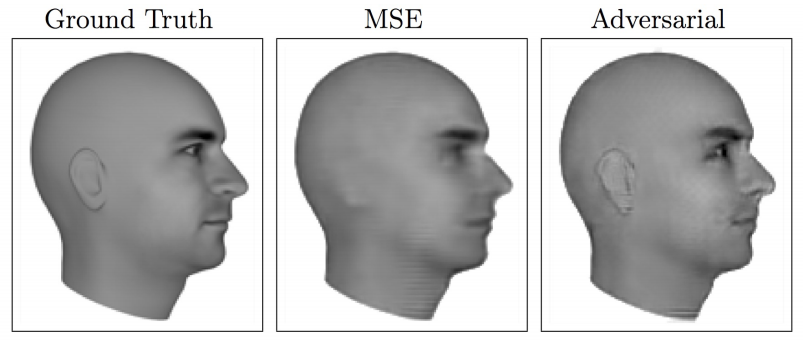 The above image is an example of a model attempting to predict the next frame of a 3d rendered moving face. The MSE predicts a �blurry� version of the many possible face positions that could be the next frame. With an additional GAN loss (a discriminator network deciding if it�s a ground truth image or from the generator), the generator is forced to choose one of the many possible positions while maintaining the sharp/detailed look of the ground truth.
