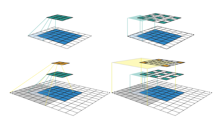 The image above shows how the receptive field grows when an input image of size 5x5 gets passed through a convolution layer with a kernel of 3, padding of 1, and a stride of 2. The left column shows the feature maps after each convolution. The right column adds blank spots in to show the stride with the color shaded regions signifying the size of the receptive field.