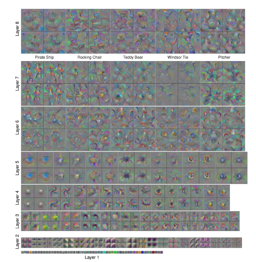 - From this part. Synthetic images maximizing a particular layer of features. Do this for at least two different layers (for example - layer 4 and layer 8.)