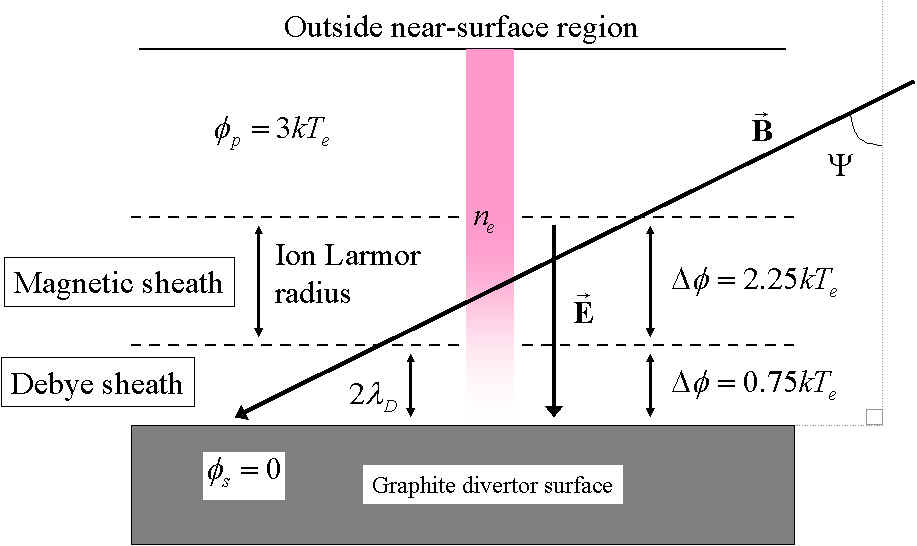 In addition to this original sheath region, called the Debye sheath in the figure below, a second sheath region comes about due to the obliquely incident magnetic field and the much larger Larmor radius (the radius of gyration about a field line) of the ions than electrons. This region is called the magnetic sheath and has a thickness on the order of the ion Larmor radius.