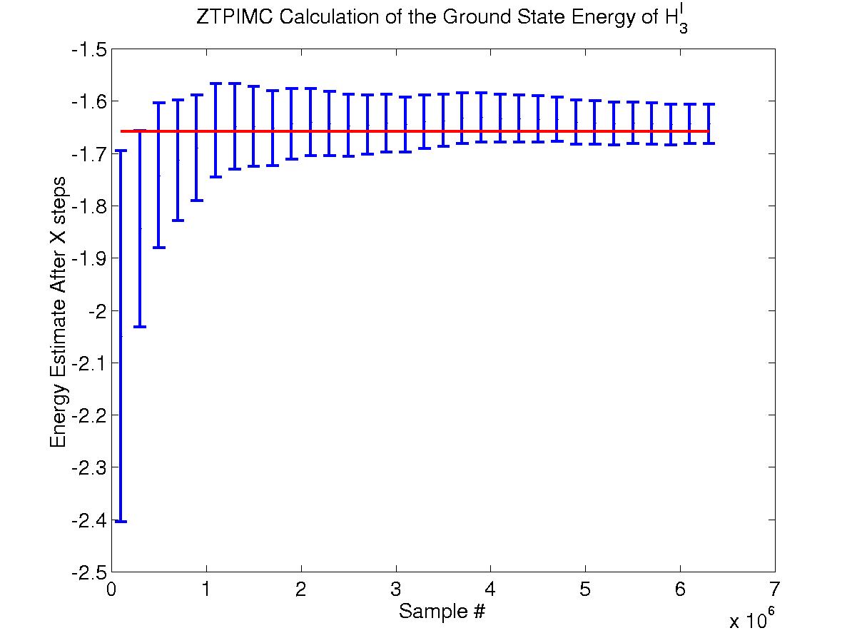 Below is a zero-temperature path integral Monte Carlo (ZTPIMC) on H3(I). The calculation ran for 6.5 million time steps at an acceptance ratio of 0.5. A time step of t=0.025 and m = 4 links was used. The red line at -1.6581(3) Hartrees is the fixed node calculation published in reference [1]. Note that the graph represents the data from a SINGLE RUN, showing the convergence of the energy to the desired results. From this run, our code calculated the ground state energy of H3(I) to be -1.642 +/- 0.1 Hartree. Note that the large error bars are a result of an extremely large autocorrelation time of approximately 2000 steps. This long autocorrelation results from the fact that we use only a simple displace move (in which each electron in each time slice is moved by a random amount in a random direction) to update our polymer chain. Thus, we do not have sufficiently refined statistics to ascertain the validity of our results.