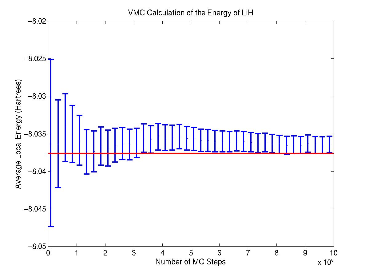 This page contains some preliminary results: Below is a variational Monte Carlo (VMC) calculation on LiH. The calculation ran for 10 million steps at an acceptance ratio of 0.5. The red line at -8.037 Hartrees demarcates Mark Dewing's result. Note that the graph represents the data from a SINGLE RUN, showing the convergence of the energy to the desired results. For this run, our code calculated the ground state energy of LiH to be -8.036 +/- 0.01 Hartrees.