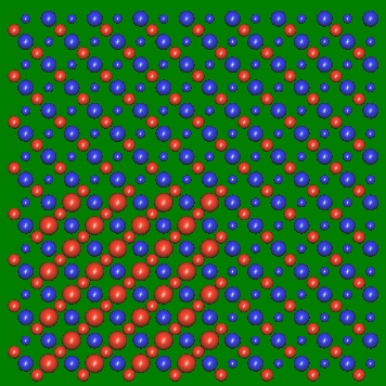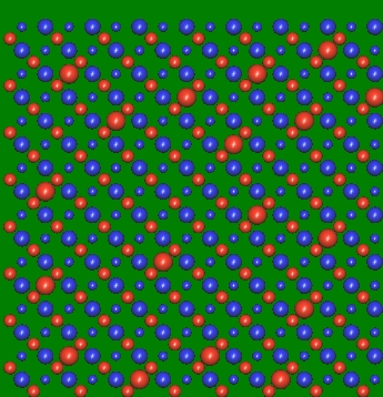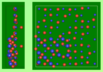 Since I have pointed out that Ga atoms prefer to move to the center of the square of the 4 As atoms of the next layer, so I can faster the process by ONLY allowing the Ga atoms to move between the centers. In another words, I use a lattice model. I must thank Xuemin Gu for this. It is his suggestion. Below is a larger size(8*8), and we can see the reconstruction pattern. Left is the original postion, right is the final position.