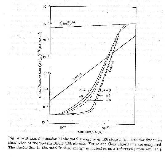 How accurate a simulation has to be in order to provide reliable statistical results is still a matter of debate. The purpose is never to produce reliable trajectories. Whatever accuracy the forces and the algorithms have, significant deviations from the exact solution will inevitably occur. Also in the real physical world individual trajectories have no meaning: in a quantum mechanical sense they do not exist and even classically they become unpredictable in the long run due to the nonisolated character of any real system. So what counts are statistical averages. It seems that very little systematic evaluation of algorithms has been done with this in mind. We have the impression that a noise as high as 10% of the kinetic energy fluctuation is still acceptable, although the accuracy of fluctuations may not be sufficient to obtain thermodynamic date from them. With such a level of inaccuracy the Verlet of leap frog algorithm is always to be preferred.