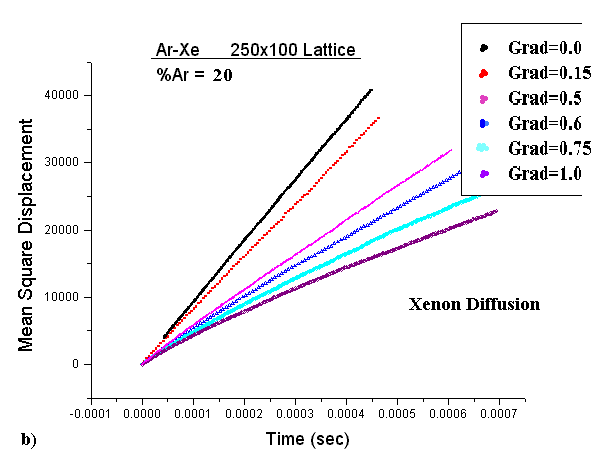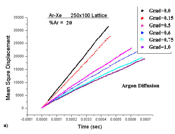Figures(8,9) display data of the mean square displacement vs. time for several trials at varying temperature gradients. The data displayed was taken on a (250x100) Ar-Xe simulation lattice with an Ar concentration of 20 percent. In contradiction to experimental results, the self diffusion of Xe is greater than the self diffusion of Ar. In addition, the magnitude of the self diffusion coefficients differ from experiment. However, we attribute this to the value of the frequency factor