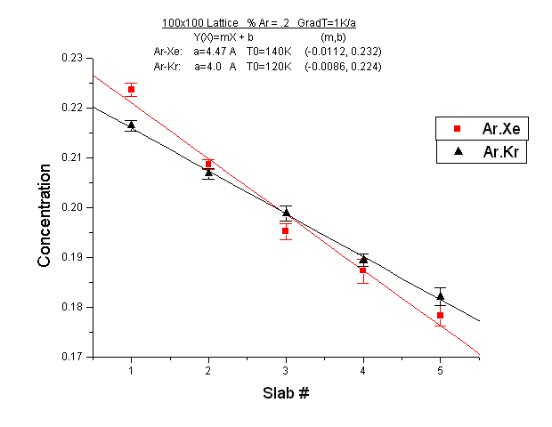 By partitioning the simulation lattice into vertical slabs as shown in figure(4) it was possible to measure a concentration gradient vs. time. Figure(10) displays data for both Ar-Xe and Ar-Kr systems below their triple-point influenced by a temperature gradient of 1 K / lattice constant. The data shows that Ar diffuses to the region of lower temperature for both systems.