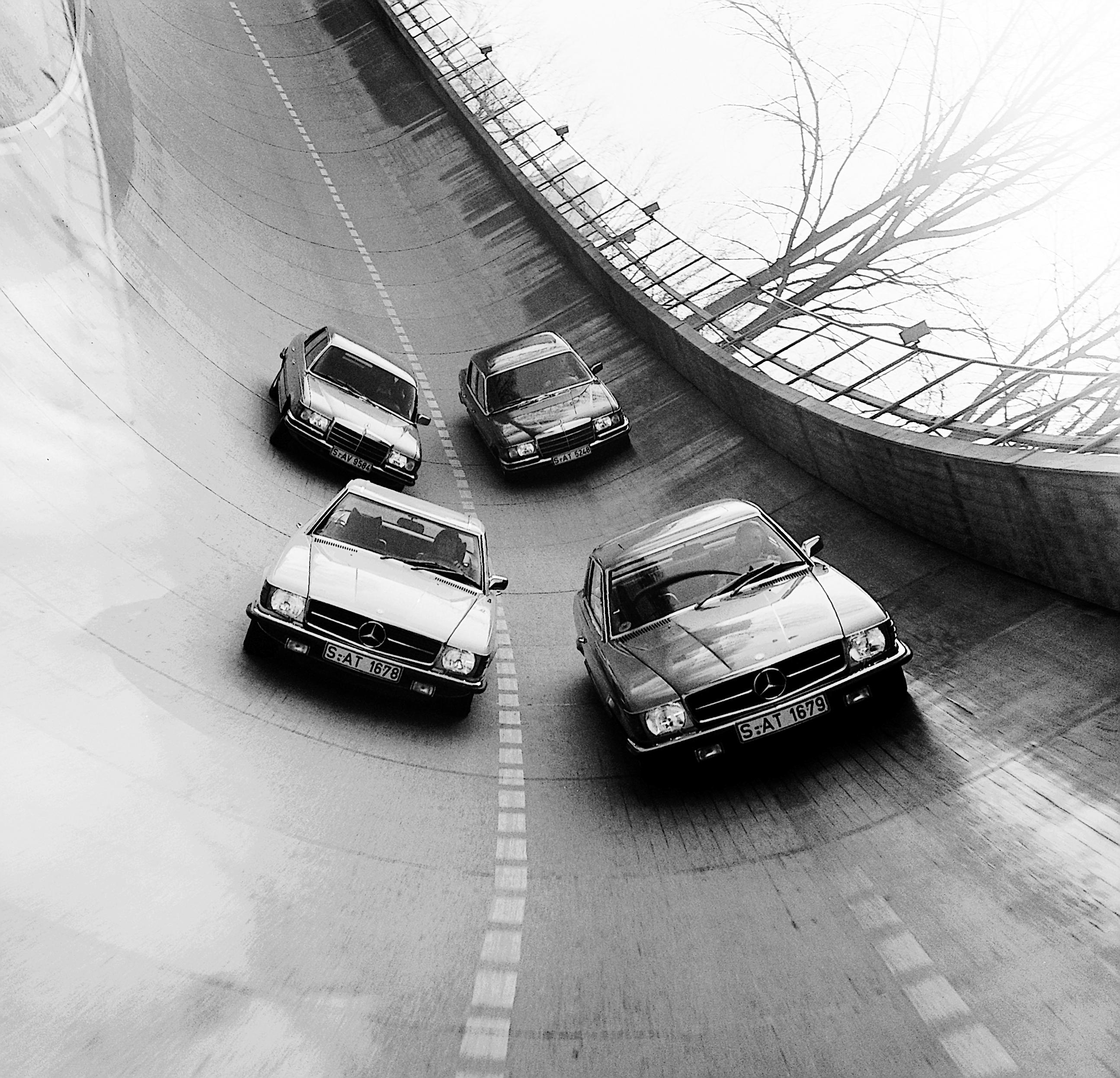 Mercedes-Benz models 450 SL and 450 SLC in the front, with models 450 SE and 450 SEL behind, on the Untertürkheim test track in 1973. Image credit: Daimler Global Media Site (full-sized image, original rotated image).
