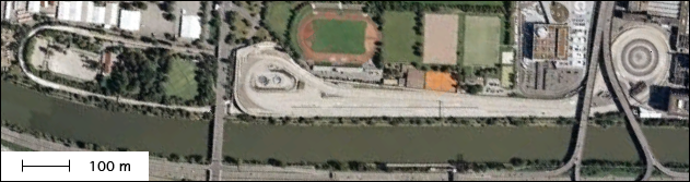 Satellite image of the Mercedes-Benz test track at Untertürkheim, on the Neckar River just outside of Stuttgart, Germany. The picture of the bus above was taken on the far-left-hand corner, which has a radius of curvature of about 50 m. Integrated with the test track is the excellent Mercedes-Benz Museum.